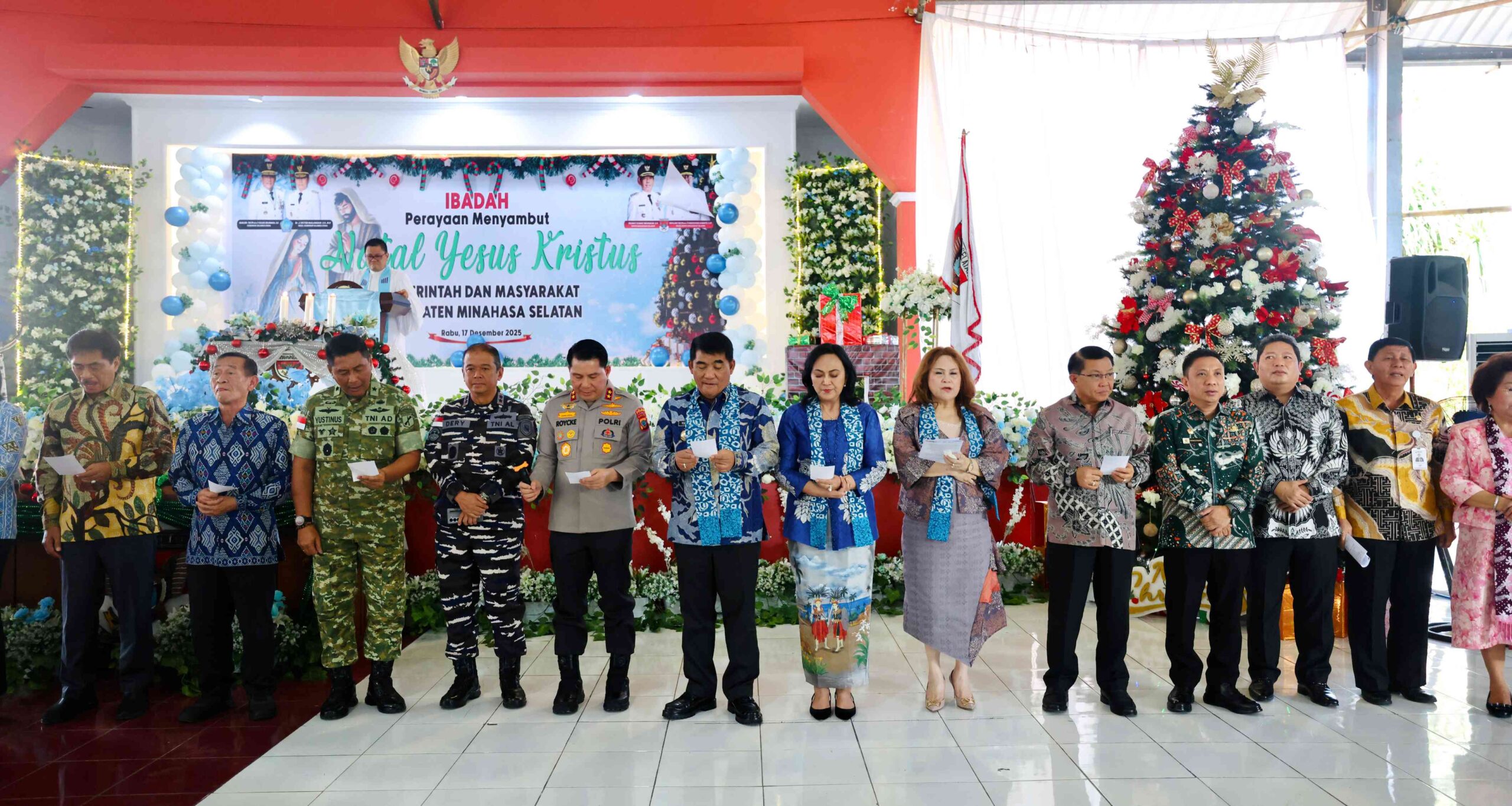 Minsel, MEDIAALTERNATIF.ID – Gubernur Sulawesi Utara (Sulut) Yulius Selvanus didampingi Istri tercinta Anik Yulius Selvanus menghadiri ibadah Natal Pemerintah Kabupaten (Pemkab) Minahasa Selatan (Minsel), di Aula Waleta Kantor Bupati Minsel, Rabu (17/12/2025).